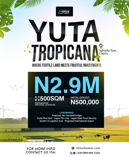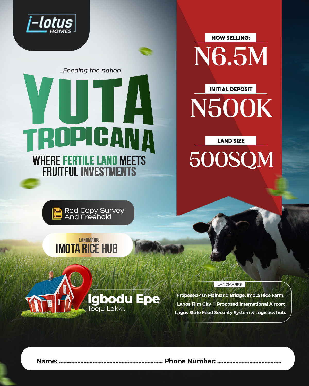 Yuta Tropicana located at Epe, Lagos is an investment property which can be used for agricultural purposes with a prospective massive ROI in years to come. It's in proximity to Imota Rice Farm, Lekki Free Trade Zone and Lagos Film City. Selling at a promo price of 2.9 million naira per plot.