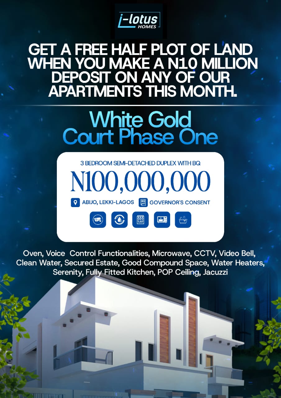 White Gold Court Phase 1 is a 3 bedroom terrace smart duplex with BQ strategically located in an estate within the heart of Lagos. If you need luxury, space and class, White Gold is the place for you and your family.